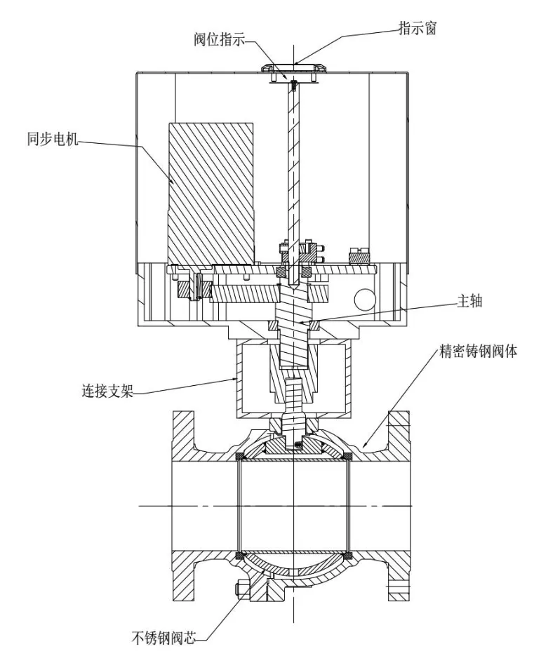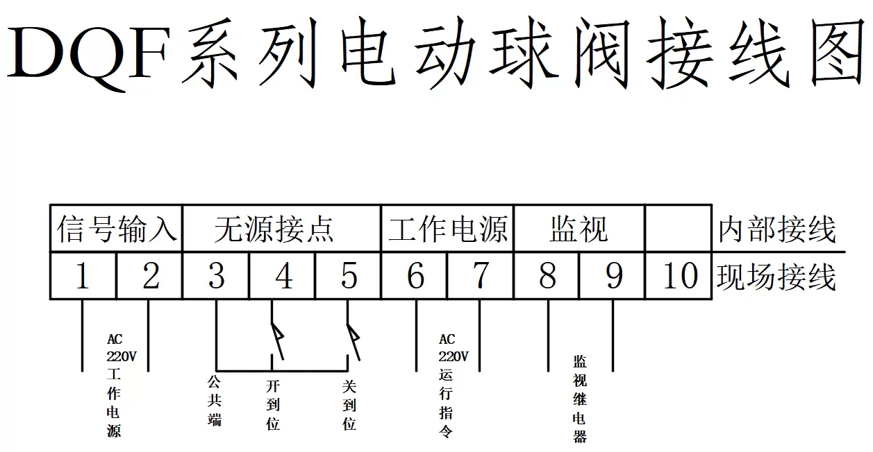 DQF系列电动球阀在无外來开启信号的情况下,在工作电源的作用下,保持全闭电锁定,此时指示盘处于全闭指示位置,电指示开关信号(继电信号)无输出。当加入 开启信号后,内部小型继电器动作,电机立即旋转,其传动轴带动主轴及不锈钢阀芯 同步旋转,经过2-3秒钟,阀位处于全开位置。在限位开关的作用下,电机停止旋转,并 且保持锁定,同时电信号开关被碰触动作,开关信号输出使控制室内指示灯有相应指 示,此时指示盘指针指示全开位置。反之,当开启电信号消失后,电机立即反转,经过2-3秒钟,在反向限位开关作用下,电机停止,此时阀位全闭,且保持全闭锁定。